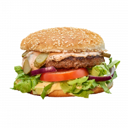 Ingredinete: chifla alba, burger vegetarian, maioneza vegetala, salata verde, rosii, ceapa, castraveti murati, sos Aurora