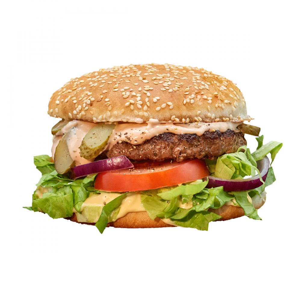 INGREDIENTE:chifla alba, burger, maioneza, salata verde, rosii, ceapa, ,castraveti murati, sos Aurora.
