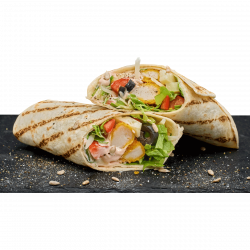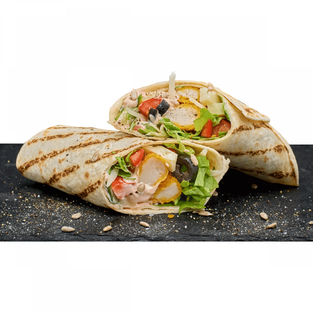 INGREDIENTE:lipie, chicken strips ,emmentaler, salata verde, rosii, castraveti, masline, porumb, sos Aurora.