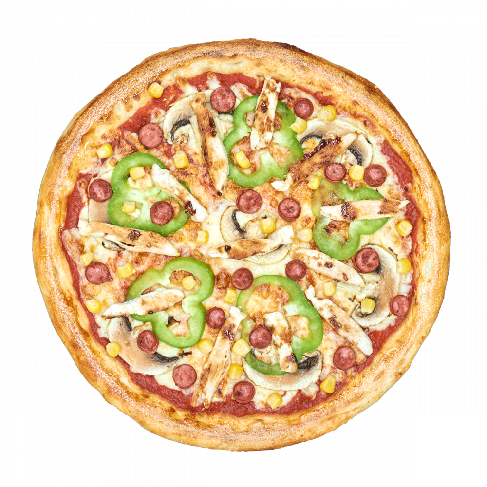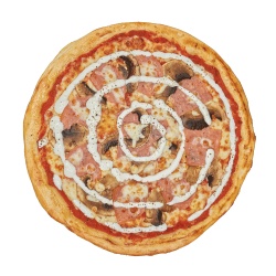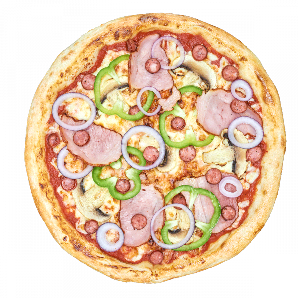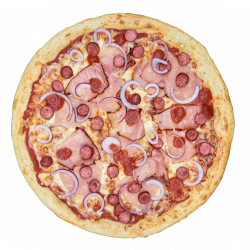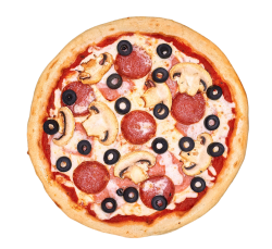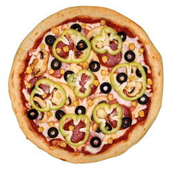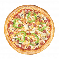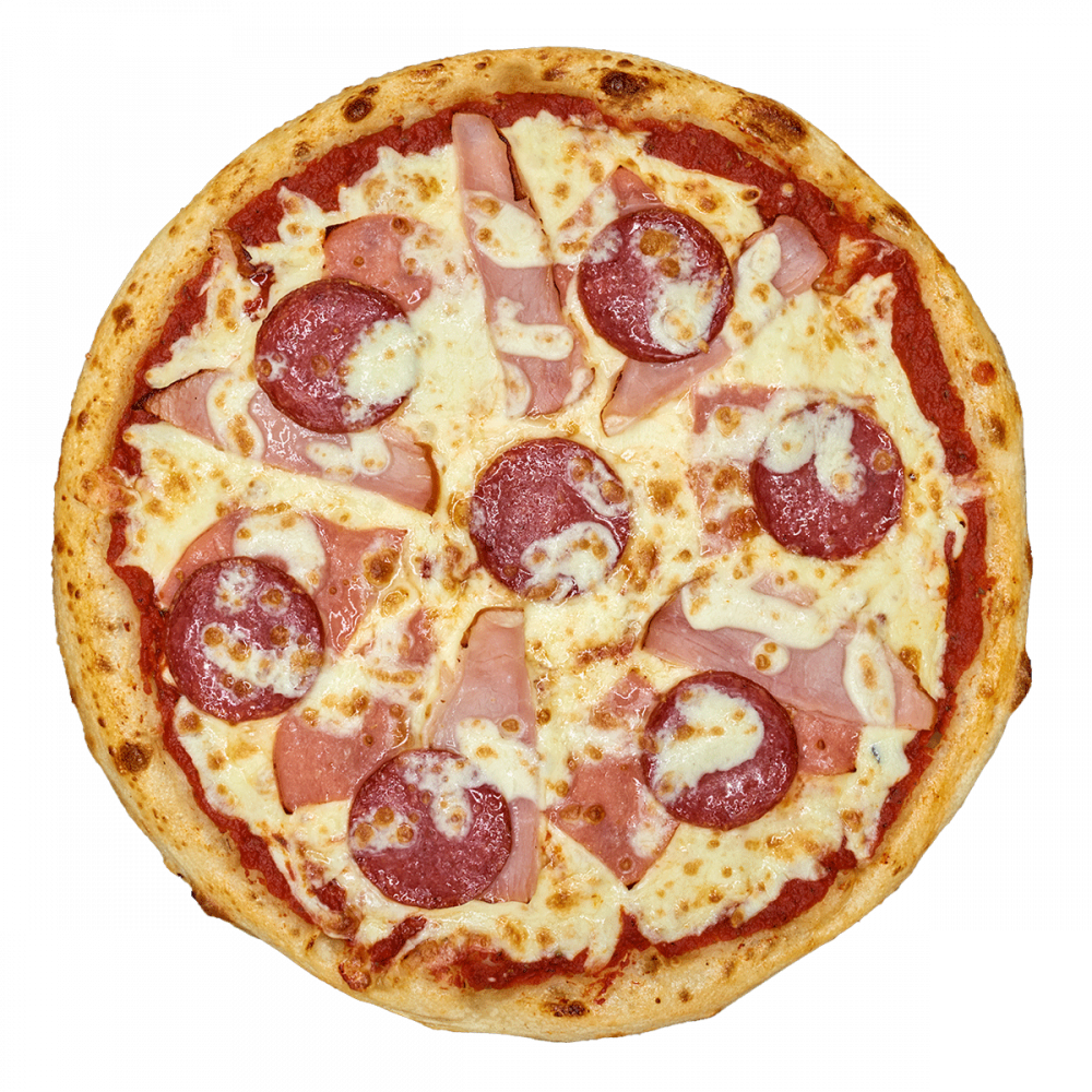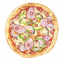 INGREDIENTE:blat, sos pizza, mozzarella, salam, ciuperci, sunca, masline, ardei gras, porumb.