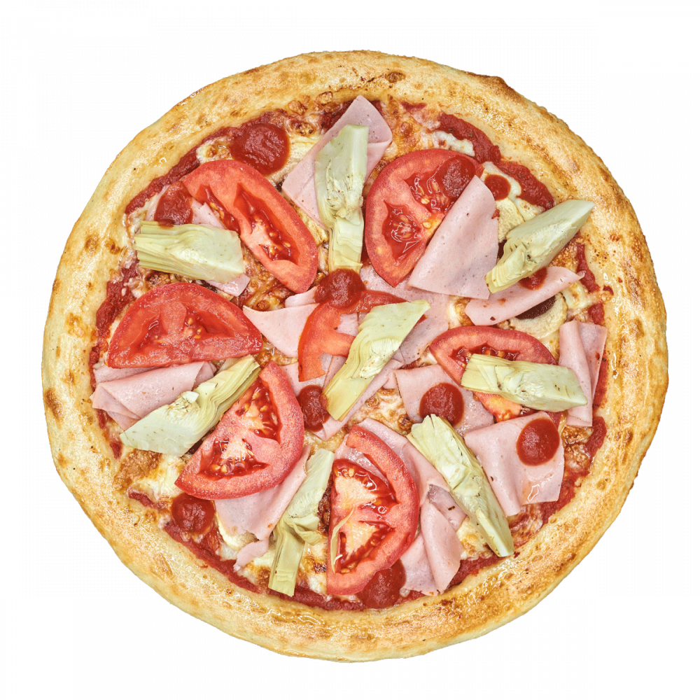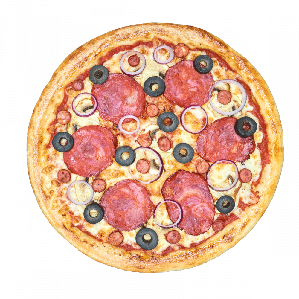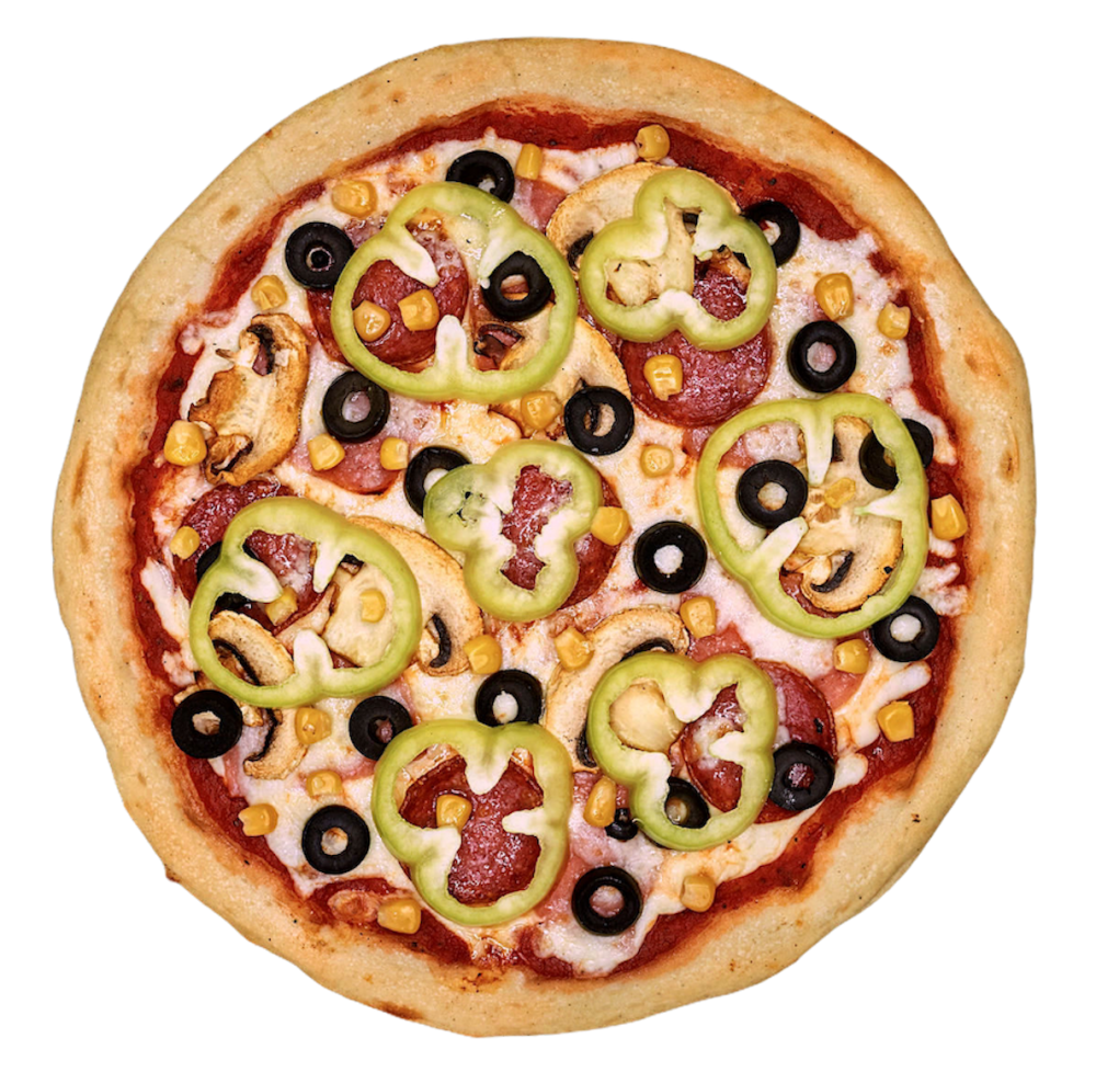INGREDIENTE:blat, sos pizza, mozzarella, salam, ciuperci, sunca, masline, ardei gras, porumb.