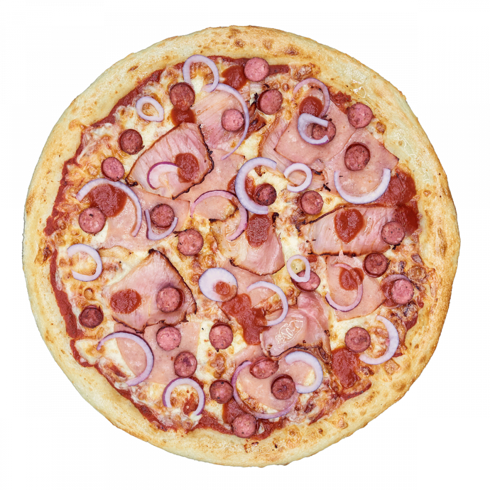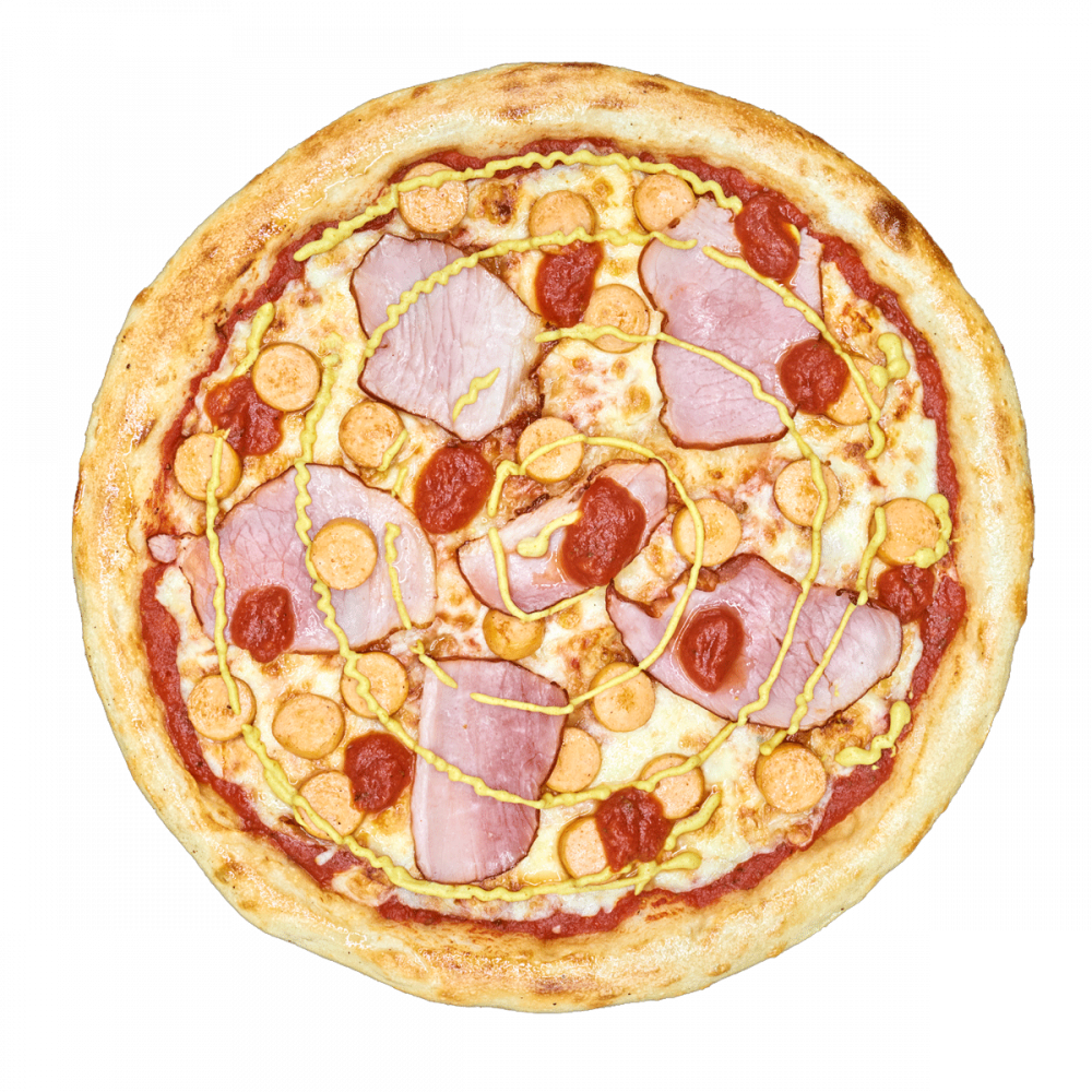 INGREDIENTE:blat, sos pizza, mozzarella, sunca, sunculita ardeleneasca, carnaciori, ceapa, sos bbq.