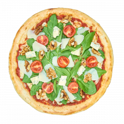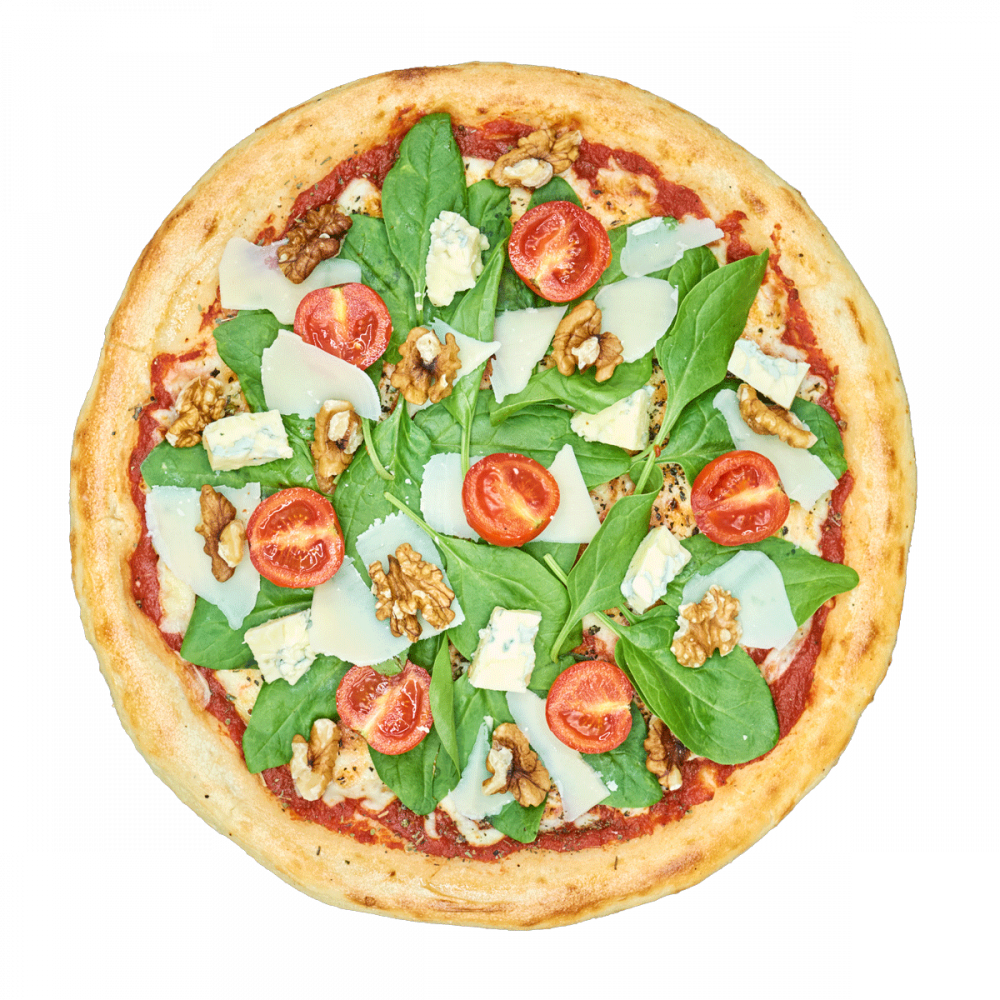 INGREDIENTE:blat, sos pizza, mozzarella, spanac, branza mucegai, rosii cherry, parmezan, miez nuca.