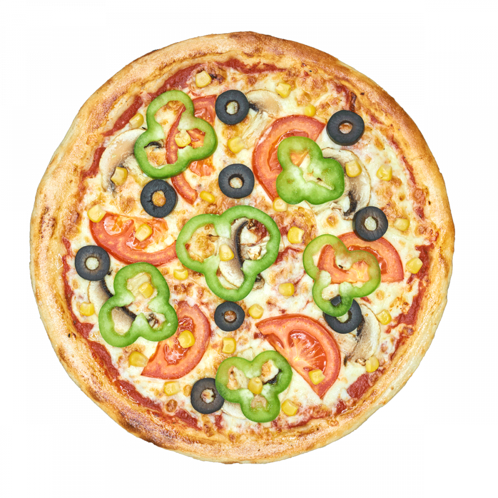INGREDIENTE:blat, sos pizza, mozzarella, ciuperci, masline, ardei gras, porumb, rosii.